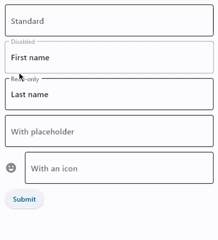 tb2 := ft.TextField(label="Disabled", disabled=True, value="First name"),